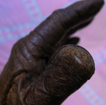 手袋に穴が開いてしまいました。ペッカリーの手袋です。13年間、冬の間だけですが使用してきたものです。鎌倉の手袋専門店「mani mani」で購入したもので、デザイナーの福島令子さんが経営されるお店です。かなり昔、全日空の機内誌で読んだ記事がもとで鎌倉まで探しに行った記憶があります。私が探していた手袋とは、いわゆるグローブではなく、薄手で手にぴったりフィットする手袋です。オーダーで注文するほど裕福ではないので、既成のもので手直ししていただけるものはないかと以前から思っていました。このお店はその条件にぴったり。当時手袋が¥30,000で、手直し1個所について¥500でした。¥30,000には躊躇もしましたが、それまで多くのペッカリーグローブで痛い目をみていたので、その質感では安いと思えたのを記憶しています。ペッカリー手袋で痛い経験をさせていただいたのは都心にある車専門の雑貨屋さんです。当時は有名でした。ぺらぺらの薄さ。そして高い。